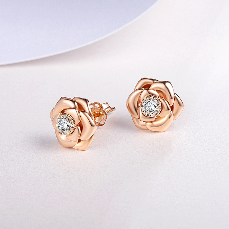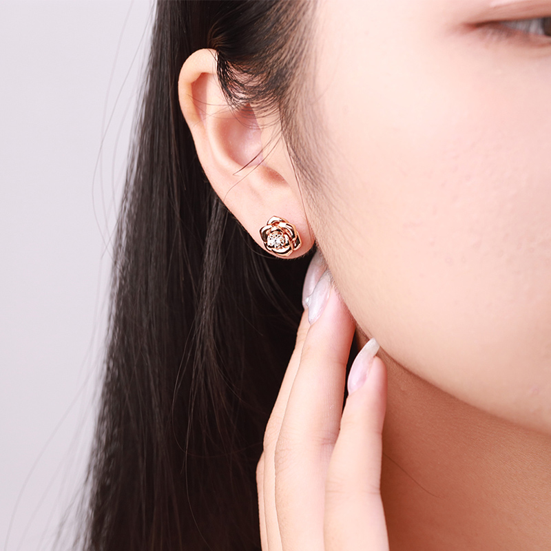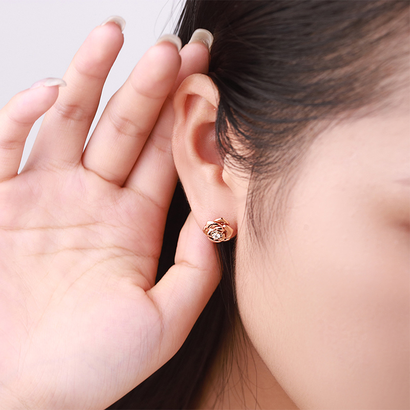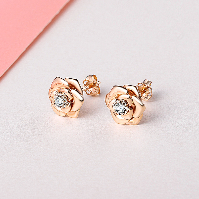 18K玫瑰金(jīn)玫瑰花鑽石耳釘花苞百搭耳飾小清新女(nǚ)款耳飾自(zì)用送閨蜜